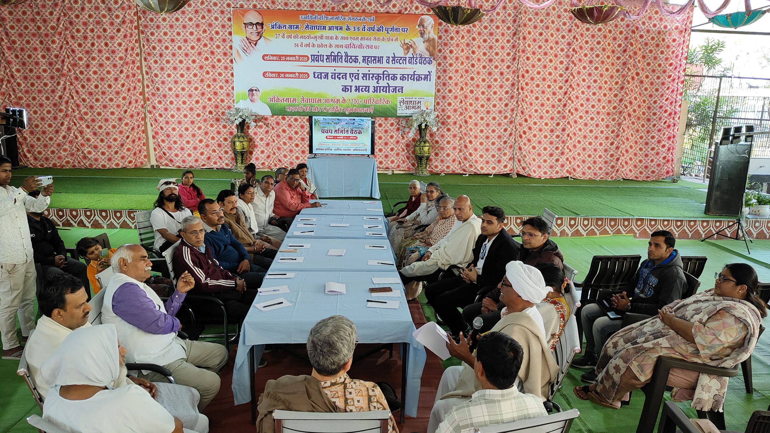 39 वर्षों से उज्जयिनी वरिष्ठ नागरिक संगठन एवं पीड़ित मानवता की सेवा, जीवदया, पर्यावरण और गौसेवा के क्षैत्र में 1989 से संचालित ‘अंकित ग्राम’, सेवाधाम आश्रम की प्रबंध समिति, महासभा एवं सेन्ट्रल बोर्ड बैठक संस्थाध्यक्ष एवं प्रसिद्ध टेक्नाॅलाजी लीडर डाॅ. ऋषि मोहन भटनागर, दिल्ली की अध्यक्षता व आश्रम संस्थापक सुधीर भाई गोयल की वरद उपस्थिति में सद्गुरू देव स्वामी रणछोड़दासजी महाराज के चित्र के समक्ष दीप प्रल्वलन कर आश्रम के मूल आधार स्तम्भों के साथ उत्तरप्रदेश शाहजहानपुर विनोबा सेवा आश्रम संस्थापक बाबा रमेश भईयाजी जमनालाल बजाज पुरस्कार से पुरस्कृत, संजय राय राष्ट्रीय सचिव हरिजन सेवक संघ दिल्ली, राष्ट्रीय युवा योजना भारत के ट्रस्टी अजय कुमार पाण्डे, काशी के मागदर्शन, वरिष्ठ समाजसेवियों, अनाम प्रेमियों एवं संस्था के सहयोगी दानदाताओं की उपस्थिति में सम्पन्न हुई। सुधीर भाई ने आश्रम के गत बैठक एवं वर्तमान वर्ष का लेखा जोखा, बजट एवं नवीन निर्माण, विभिन्न योजनाओं एवं आश्रम को स्वावलम्बी बनाने हेतु चर्चा उपरांत निर्णय लिए गए।