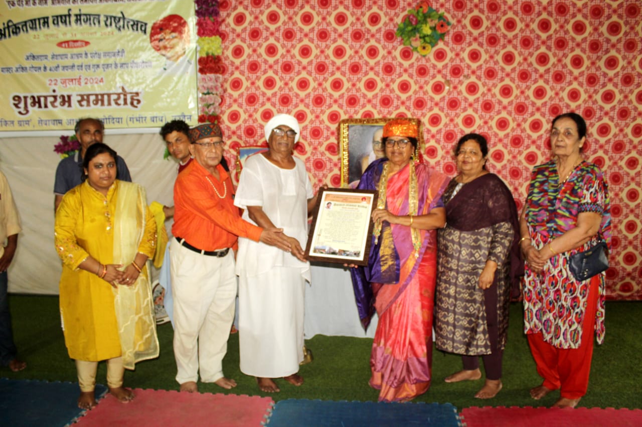 ‘अंकित ग्राम’ सेवाधाम आश्रम के परोक्ष समाजसेवी मास्टर अंकित गोयल के 40वें अवतरण दिवस पर 32वाँ 41 दिवसीय अंकितग्राम वर्षा मंगल राष्ट्रोत्सव का शुभारंभ मध्यप्रदेश के मुख्यमंत्री डाॅ. मोहन यादव की बड़ी बहन एवं सभापति नगर पालिक निगम श्रीमती कलावती यादव के मुख्य आतिथ्य, विशेष अतिथि समाजशास्त्री आचार्य शैलेन्द्र पाराशर, अध्यक्ष सर्वभौम मानव विकास संस्थान, आश्रम संस्थापक सुधीर भाई गोयल, राजेन्द्र सिंह जादौन संस्थापक ज्ञान संस्कार पब्लिक स्कूल, अम्बोदिया, डाॅ. सचिन गोयल, कुंज बिहारी सहगल, श्रीमती कांता भाभी, श्रीमती मंजू वनवासी, श्रीमती अनिता गोयल, मोनिका दीदी एवं गोरी दीदी सहित अनेक गणमान्यजनों की उपस्थिति में सम्पन्न हुआ।